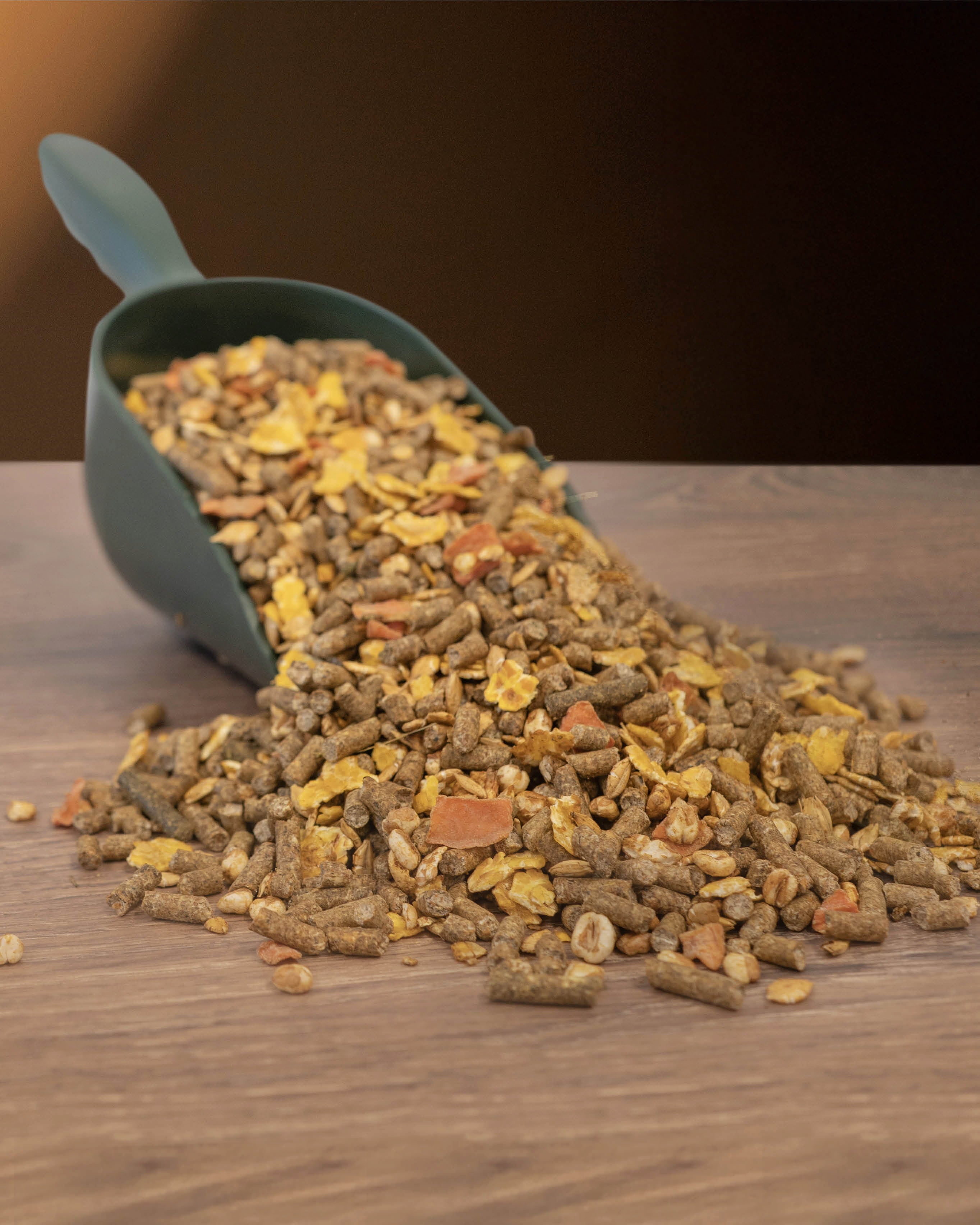 salvado de trigo, copos de maíz, vainas de guisantes, copos de cebada, cebada, trigo, linaza prensada, melaza de caña de azúcar, torta de extracción de girasol (con (Jabón)caldo), trigo inflado, maerl, zanahorias secas, carbonato cálcico, cloruro sódico
