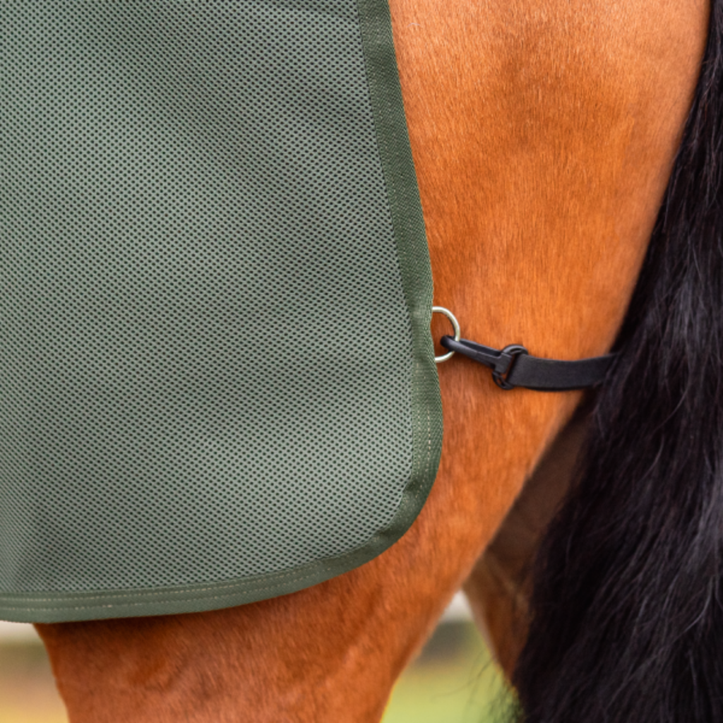 La manta de ejercicio 3D Air FL revoluciona tu entrenamiento en los días calurosos gracias al innovador tejido de malla 3D-AIR, que garantiza una circulación de aire sin precedentes. Esta estructura especial del tejido actúa como un aire acondicionado para el dorso de tu caballo, expulsando activamente el aire húmedo y creando al mismo tiempo una capa protectora de aire. El material es tan ligero y flexible que sigue sin esfuerzo cada movimiento del caballo, sin interferir con las ayudas de las piernas. Apreciarás especialmente el tejido funcional de secado rápido tras sesiones intensas, ya que favorece de forma óptima la recuperación de tu caballo. El resistente tejido de malla también es muy fácil de limpiar y mantiene su forma incluso después de un uso frecuente.