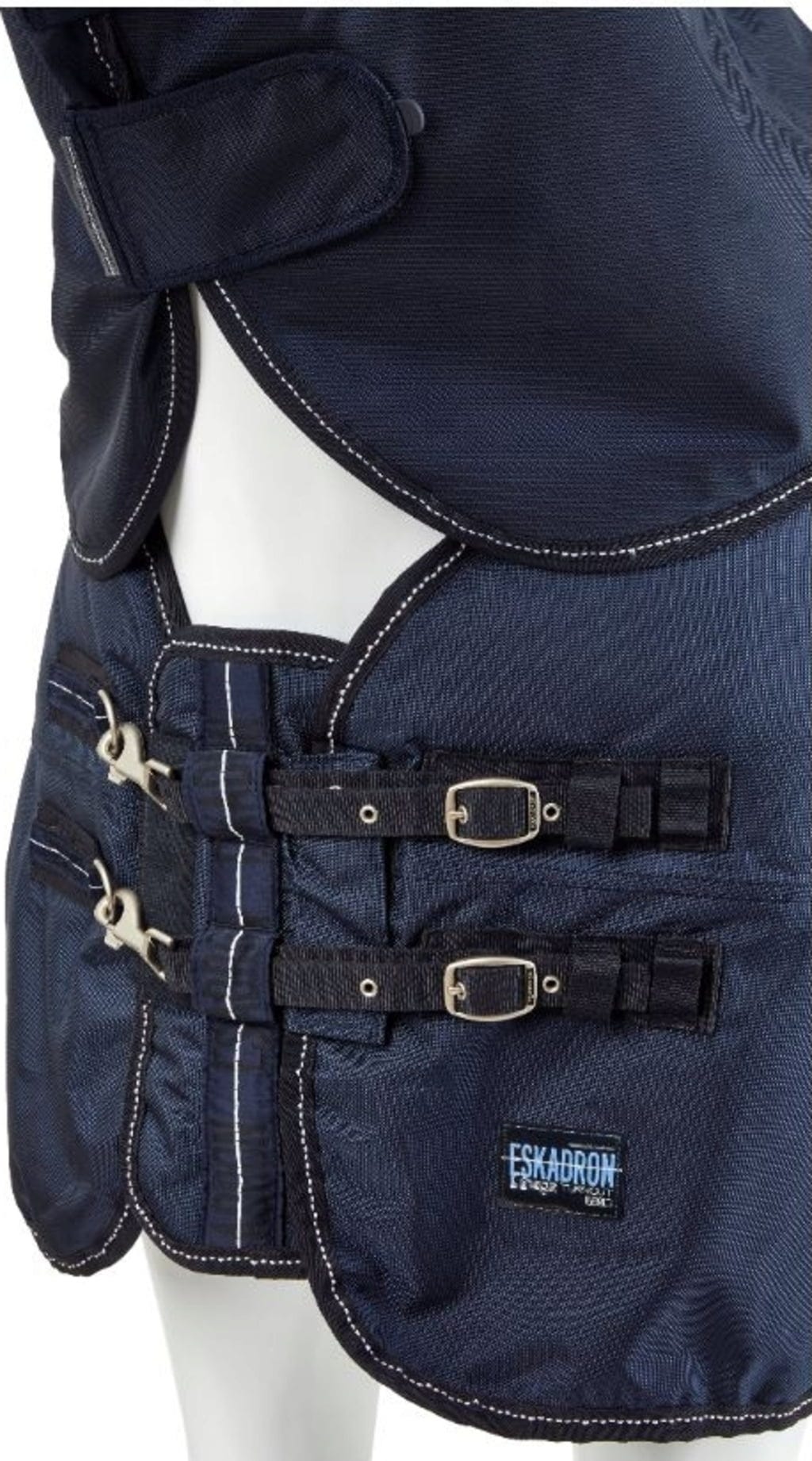 Manta de exterior con función antisudor. El tejido exterior es de poliéster 1680D resistente. En la zona de las patas delanteras incorpora neopreno flexible para un mejor ajuste. El cuello es desmontable y cuenta con protección de neopreno suave en la zona de la crin para evitar rozaduras. Los cierres frontales ajustables garantizan una sujeción óptima e incluye una extensión de pecho adicional que puede usarse por separado.