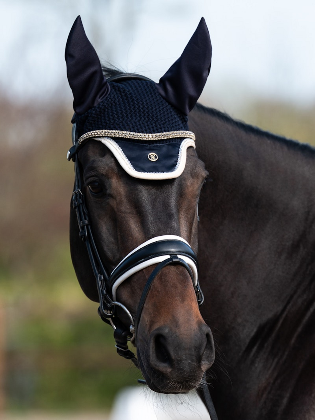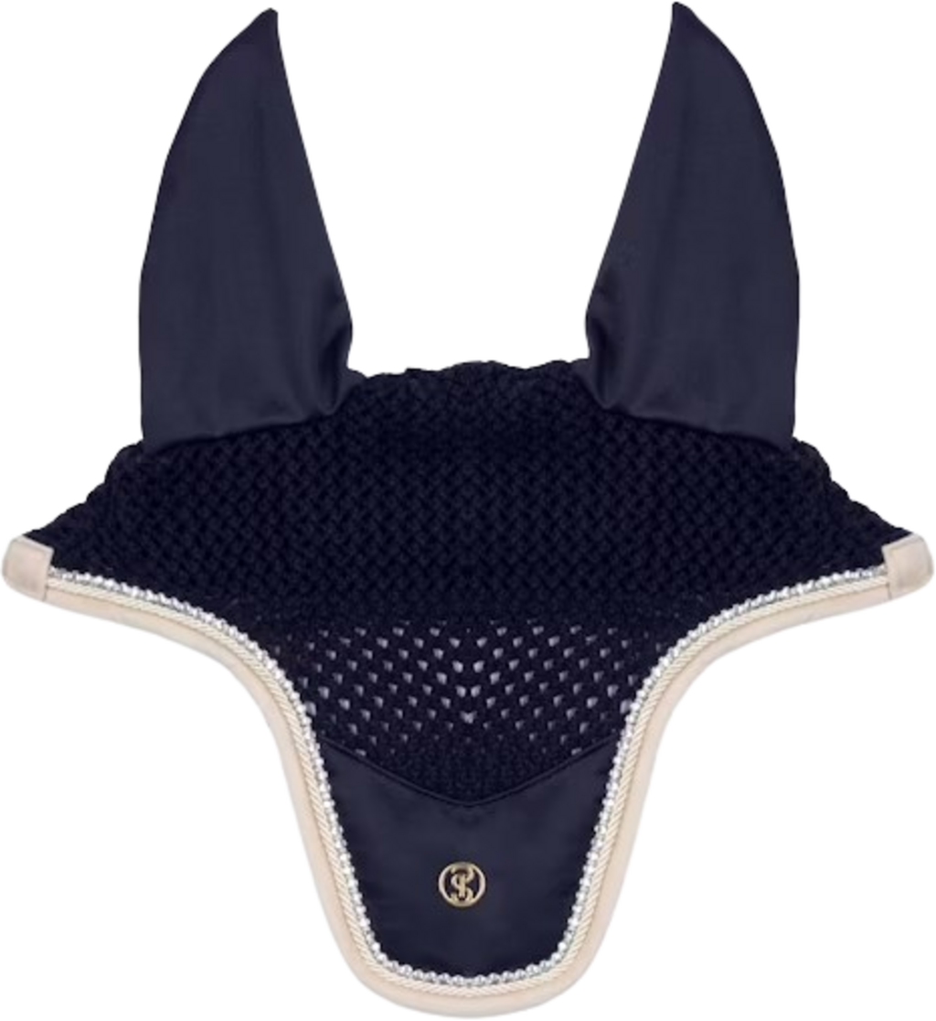 La capucha antimoscas Vintage Monogram tiene una forma anatómica y se adapta perfectamente gracias a las orejas de tejido elástico. El diseño de ganchillo hecho a mano en la parte delantera crea un look elegante, mientras que el borde con una banda de cristales brillantes y un acabado de cordón brillante añade un toque especial. El cierre de velcro en la parte trasera mantiene la red antimoscas firmemente sujeta a la brida. Protege al caballo de los insectos y garantiza una concentración ininterrumpida durante el entrenamiento y la competición. El diseño se completa con el logotipo PS en metal.