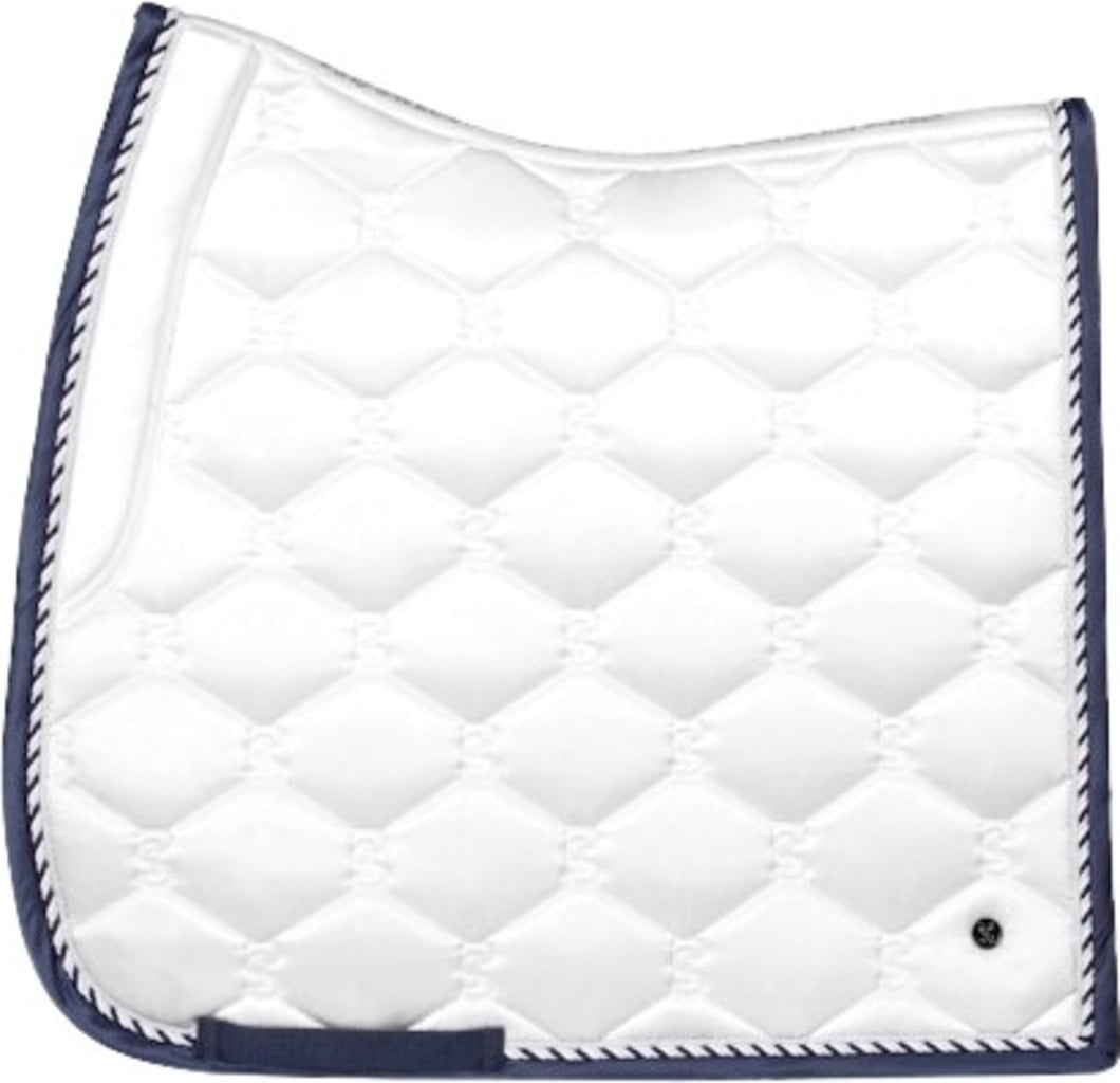 Gracias al acolchado de grosor medio y a las almohadillas antideslizantes, la mantilla se mantiene firmemente en su sitio durante el entrenamiento o en la pista. Detalles especiales como el motivo acolchado decorativo, el elegante ribete y la cita bordada a lo largo del lomo la convierten en una verdadera atracción. Con las correas del cinch bordadas y el logotipo PS en metal, la mantilla Dressage Signature también destaca por su artesanía y durabilidad.
