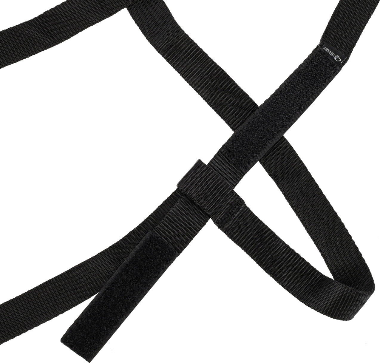 Cierre de velcro en la nuca como sistema de liberación de seguridad: si la cabezada se somete a una fuerte tracción (por ejemplo, en caso de engancharse en una valla u objeto), el velcro se abre automáticamente. De esta manera, el caballo puede liberarse, lo que reduce considerablemente el riesgo de estrangulamiento o lesiones graves.