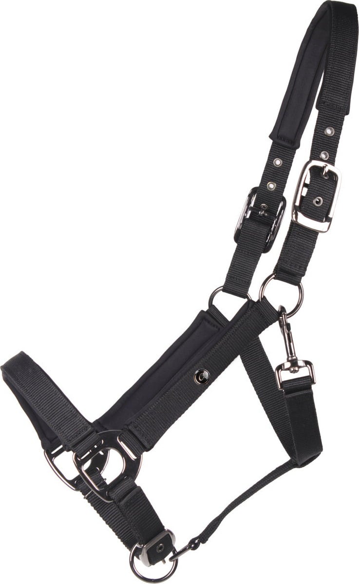 Para un ajuste óptimo, la cabezada se puede ajustar fácilmente en dos puntos: en la nuca y en la muserola. Los elegantes acabados metálicos de zinc negro le dan un aspecto refinado, mientras que el práctico mosquetón en la garganta permite ponérsela y quitársela de forma rápida y sencilla.