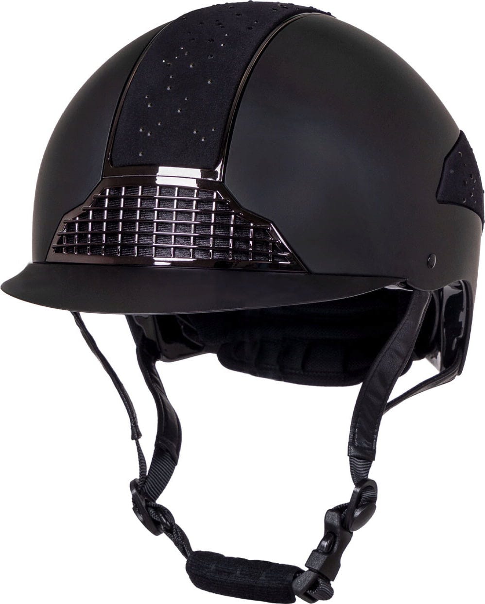 El casco de equitación Ohio de QHP es un modelo cómodo y refinado, ideal tanto para el entrenamiento como para las competiciones. Destaca por su elegante diseño y por los diamantes de imitación integrados en la carcasa exterior, fabricada con materiales de alta calidad que le dan al casco un aspecto único. A pesar de su estructura robusta, el casco es sorprendentemente ligero.