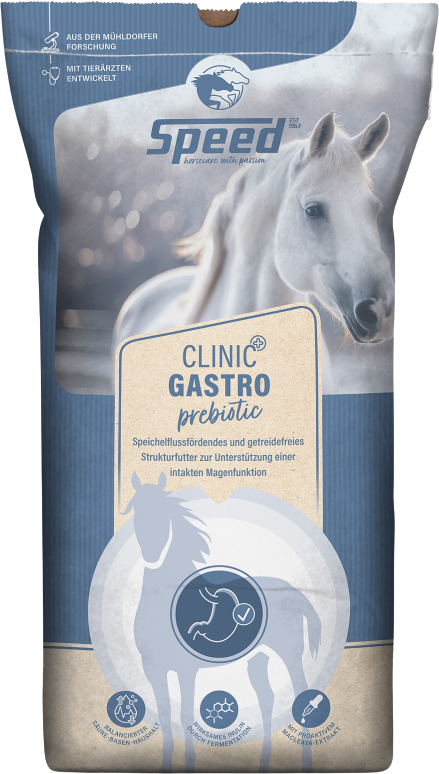 Con el pienso completo y equilibrado Clinic Gastro Prebiotic de SPEED, obtienes una solución concentrada especialmente desarrollada para tu caballo con digestión sensible. Este pienso sin cereales ha sido formulado en colaboración con institutos de investigación y clínicas equinas para dar prioridad a las fibras brutas de alta calidad y a los ingredientes vegetales seleccionados.