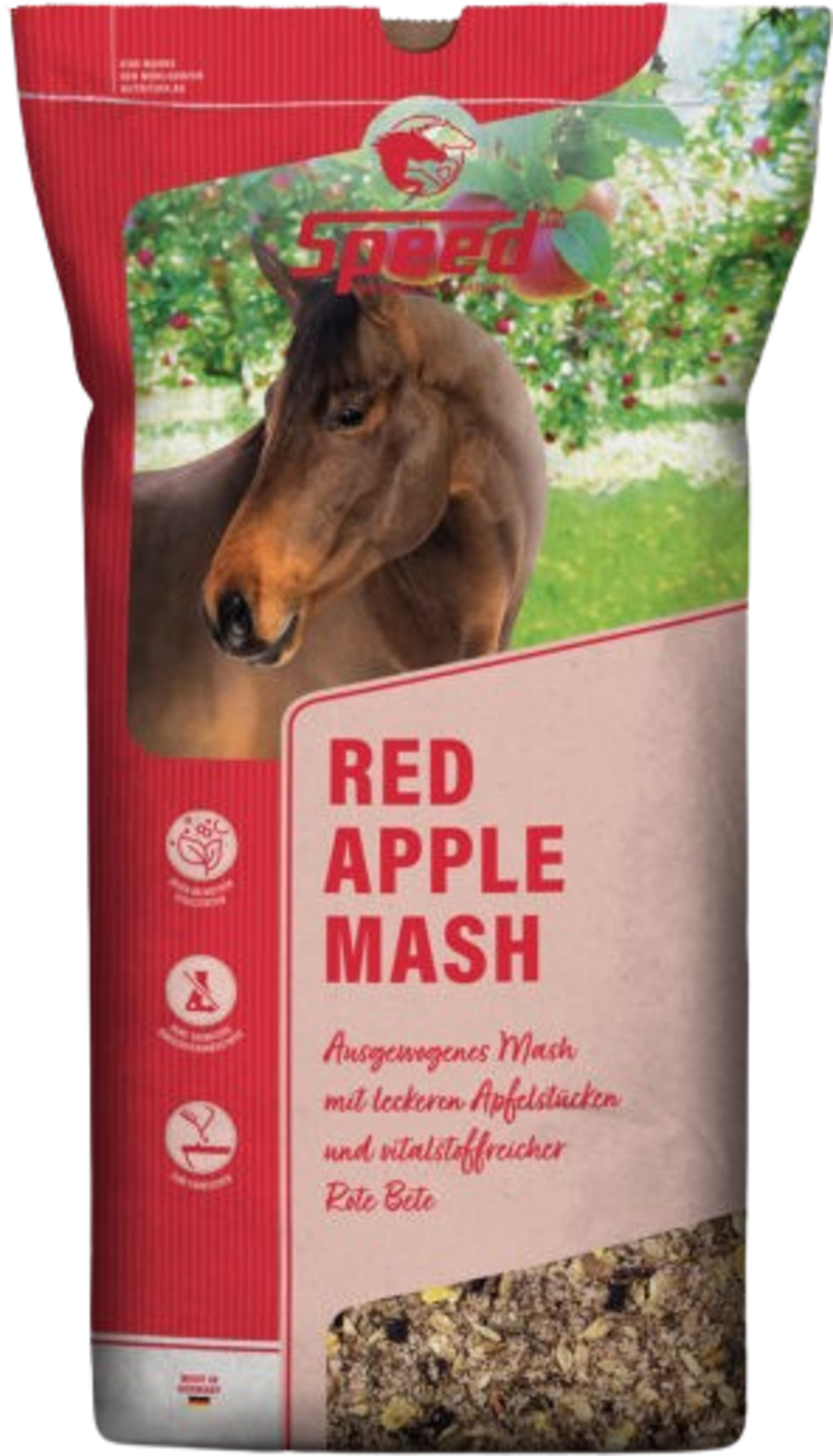 salvado de trigo, copos de cebada, copos de maíz, avena negra, remolacha[1], 6,86 % bagazo de manzana[1], torta de prensa de linaza, avena, Melaza, linaza, maíz, 1 % manzana[1], copos de zanahoria, levadura de cerveza[1], torta de extracción de girasol, pulpa de achicoria, aceite de linaza, cloruro de sodio