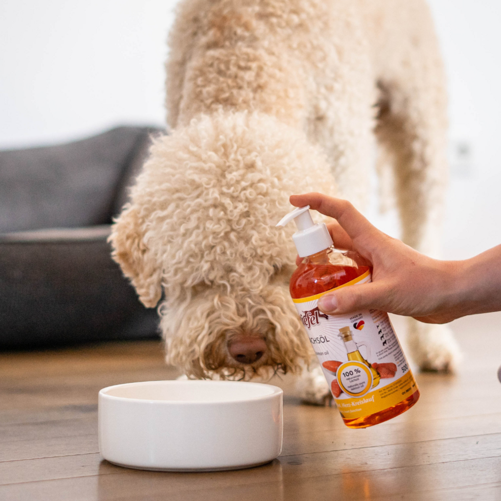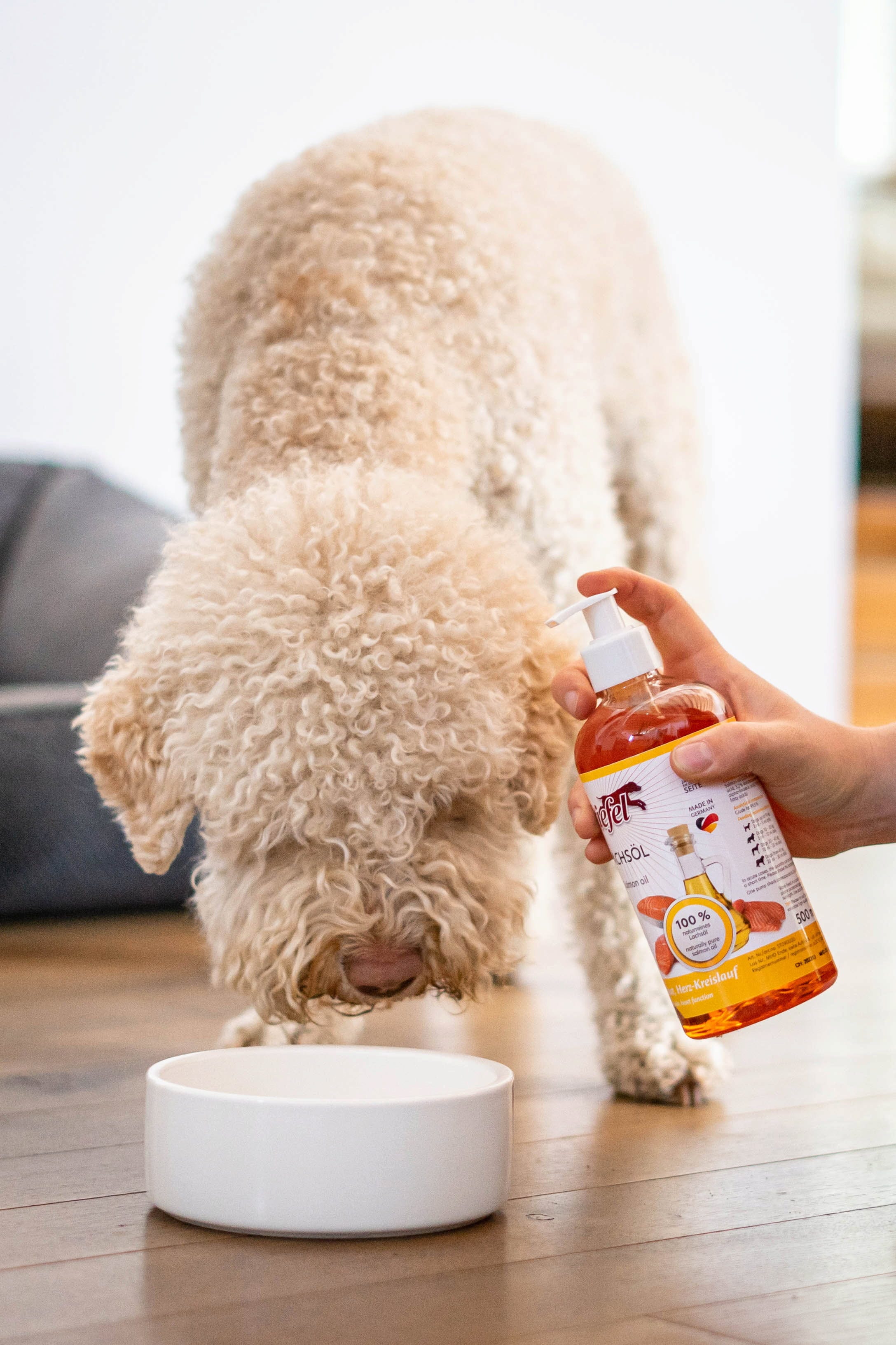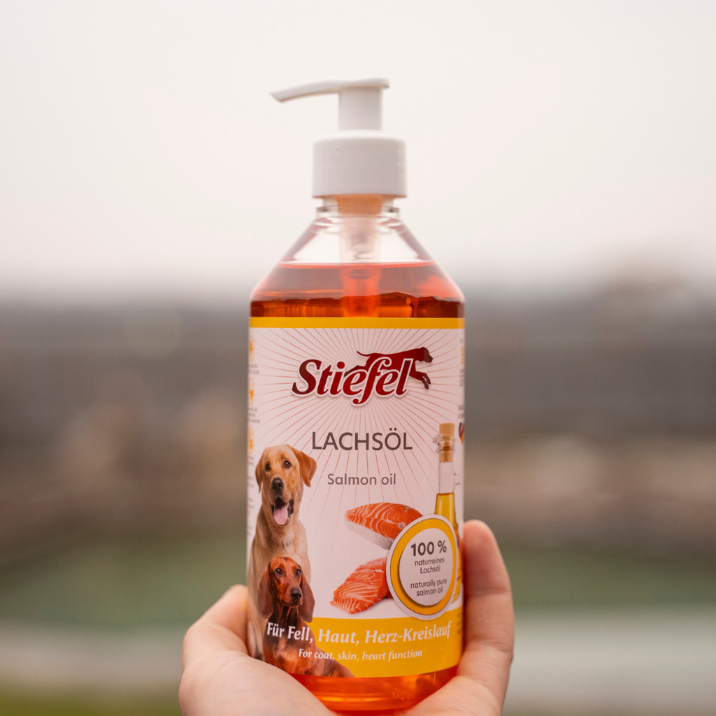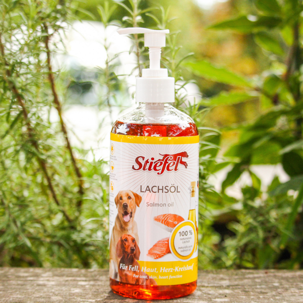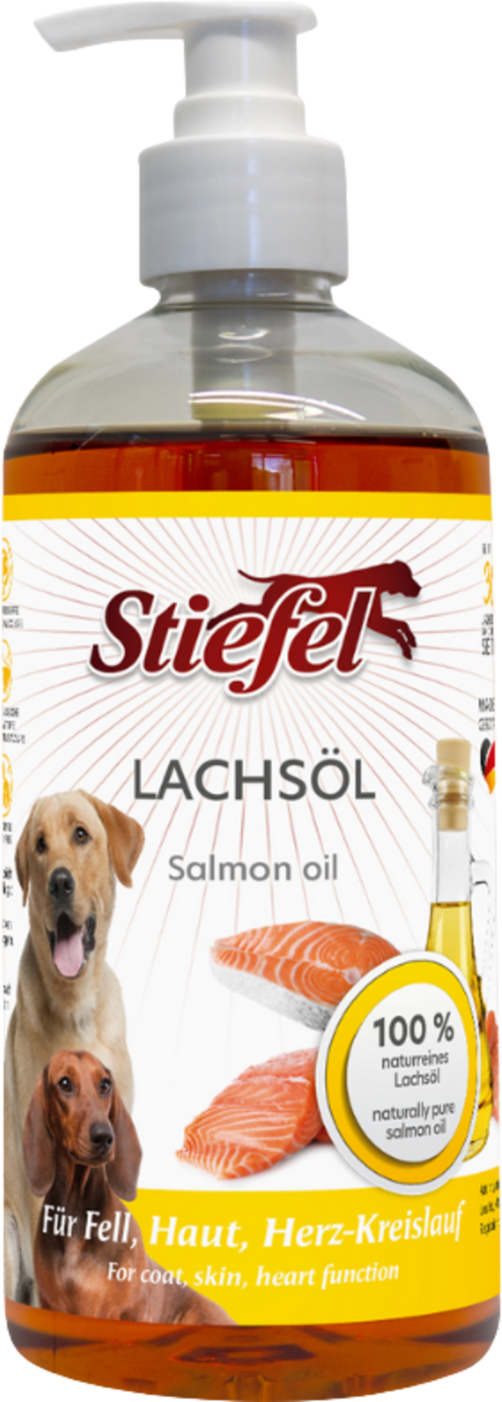 El aceite de salmón de Stiefel es un aceite de alta calidad con ácidos grasos omega-3 y 6. Los ácidos grasos que contiene pueden favorecer el pelaje, la piel, el sistema cardiovascular e inmunológico y la función articular. Muchos perros perciben su olor y sabor de forma muy positiva, por lo que se cree que el aceite de salmón estimula el apetito.