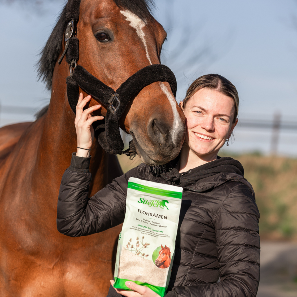 NOTA: Las cáscaras de Psyllium siempre deben ablandarse por completo con suficiente agua, de lo contrario se pueden producir cólicos de estreñimiento. Además, el caballo siempre debe tener acceso ilimitado al agua.
