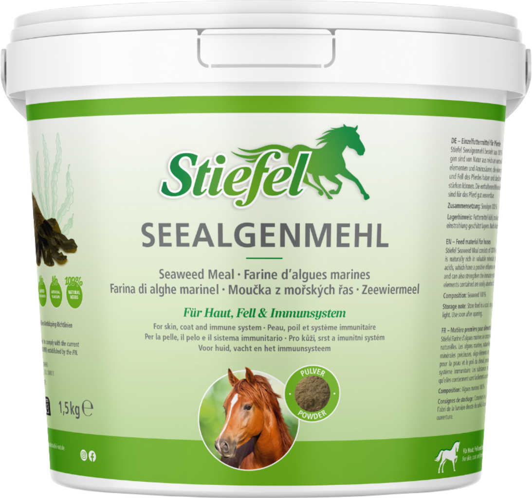 La harina de algas marinas de Stiefel se compone de algas 100 % naturales. Las algas marinas son una de las llamadas algas pardas y son ricas en valiosos minerales, oligoelementos y aminoácidos. Este producto puede tener un efecto positivo en la piel y el pelaje del caballo gracias a su valiosa composición. Además, se puede apoyar el sistema inmunitario y fortalecer las propias defensas del organismo. Dado que los ingredientes se encuentran en una forma ligada orgánicamente, se pueden utilizar de manera óptima sin tener que transformarlos nuevamente en el cuerpo.