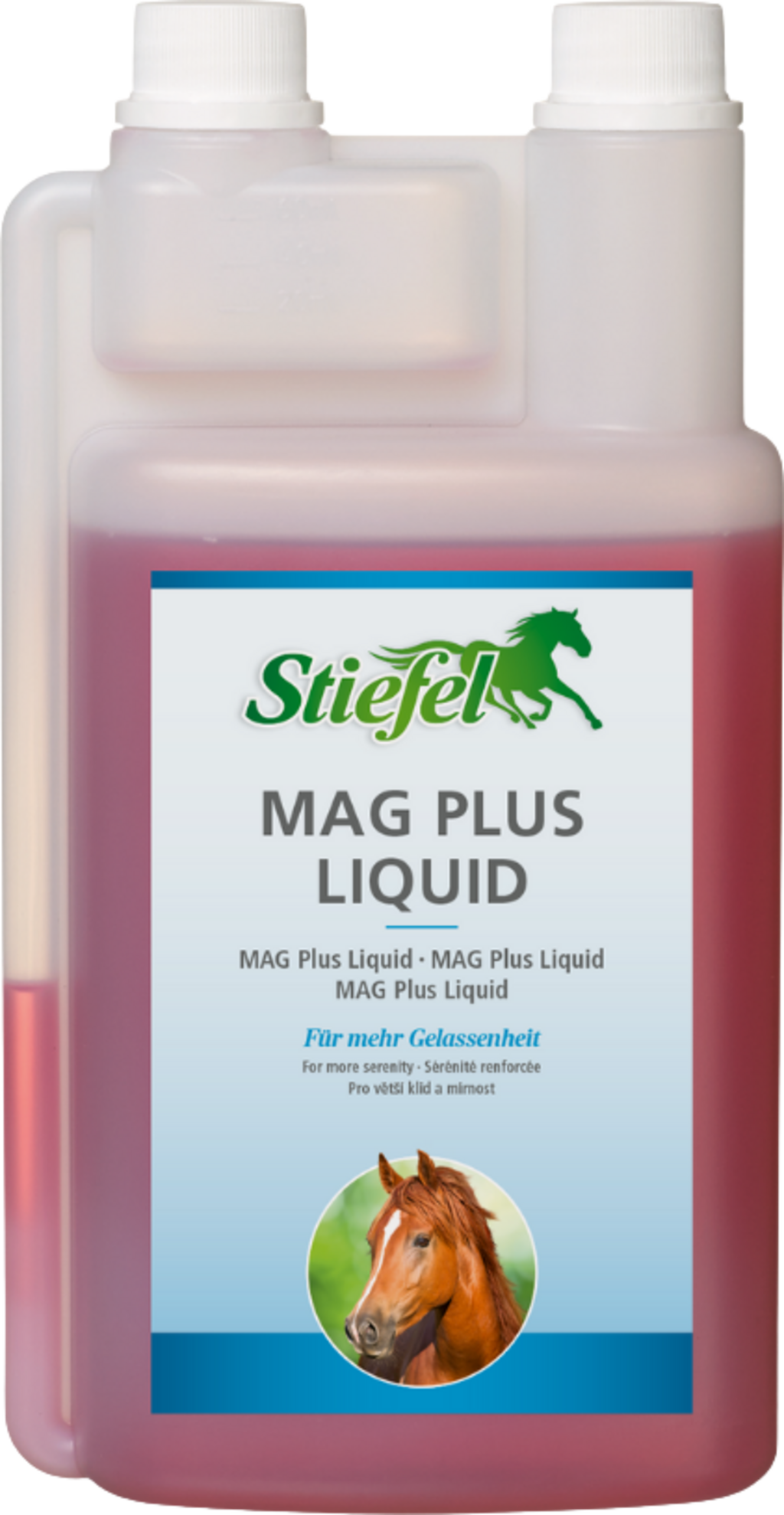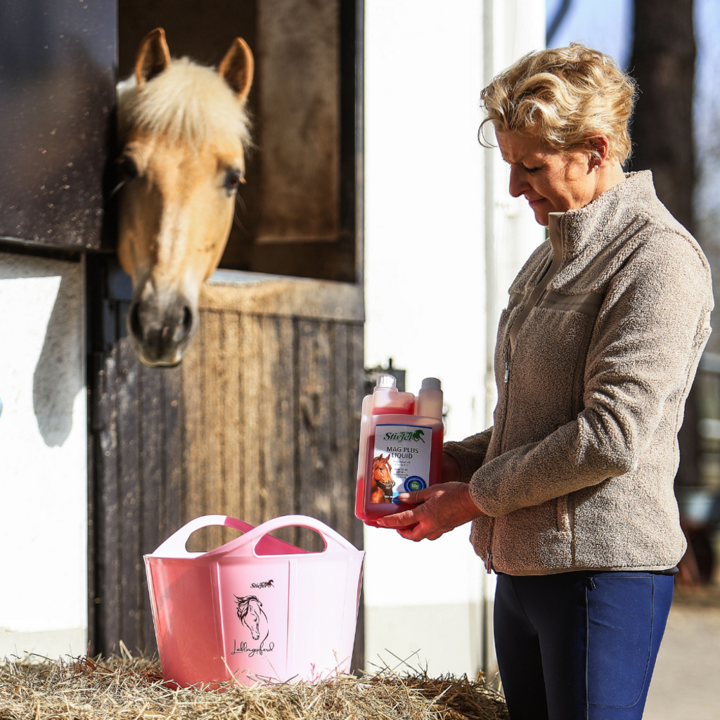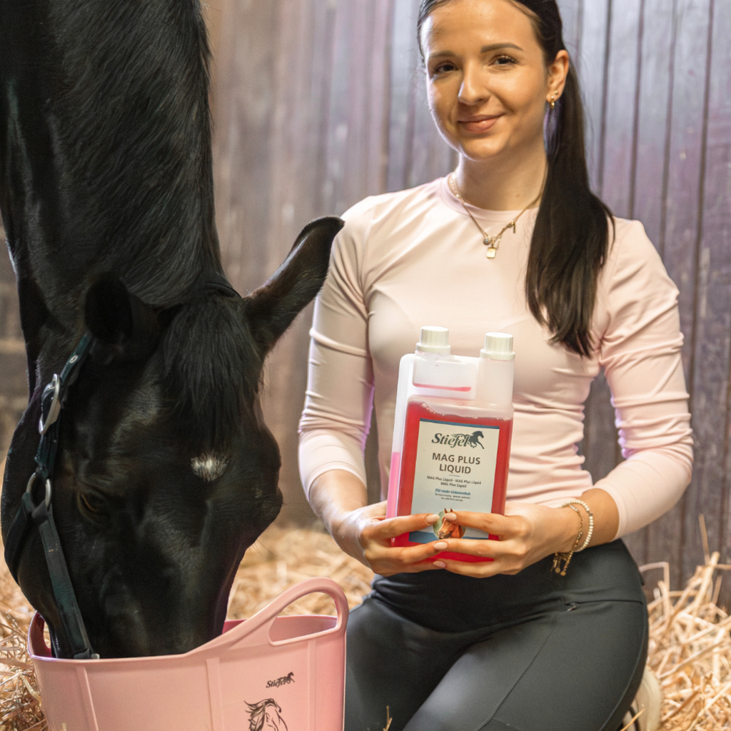 Mag Plus Liquid de Stiefel es un alimento dietético líquido para reducir las reacciones de estrés y aumentar la resiliencia. La eficaz combinación de magnesio, triptófano y zinc puede tener un efecto positivo en caballos nerviosos, que se irritan fácilmente y estresados en caso de síntomas de deficiencia relacionados con la alimentación. Esto puede influir positivamente en la resiliencia, la concentración y la voluntad. Si el caballo está bajo estrés, se necesitan grandes cantidades de magnesio, ya que el magnesio, como antagonista del calcio, puede normalizar nuevamente el aumento de la actividad cardíaca. Asimismo, el aumento de magnesio se excreta cuando se liberan hormonas del estrés como el cortisol y la adrenalina. Si aumenta el nivel de estrés del caballo, también aumenta el consumo y, por tanto, la necesidad de magnesio en el cuerpo del caballo. La falta de magnesio puede aumentar aún más los efectos del estrés. La vitamina B12 añadida puede fortalecer los nervios y favorecer la concentración.
