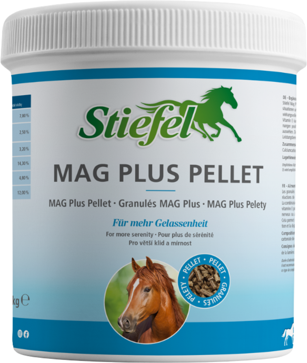 Mag Plus Pellet de Stiefel consiste en una combinación de magnesio, vitamina E y vitamina B12 para reducir las reacciones de estrés en los caballos. Si el caballo está bajo estrés, se necesitan grandes cantidades de magnesio, ya que el magnesio, como antagonista del calcio, puede normalizar nuevamente el aumento de la actividad cardíaca. Asimismo, el aumento de magnesio se excreta cuando se liberan hormonas del estrés como el cortisol y la adrenalina. Si aumenta el nivel de estrés del caballo, también aumenta el consumo y, por tanto, la necesidad de magnesio en el cuerpo del caballo.