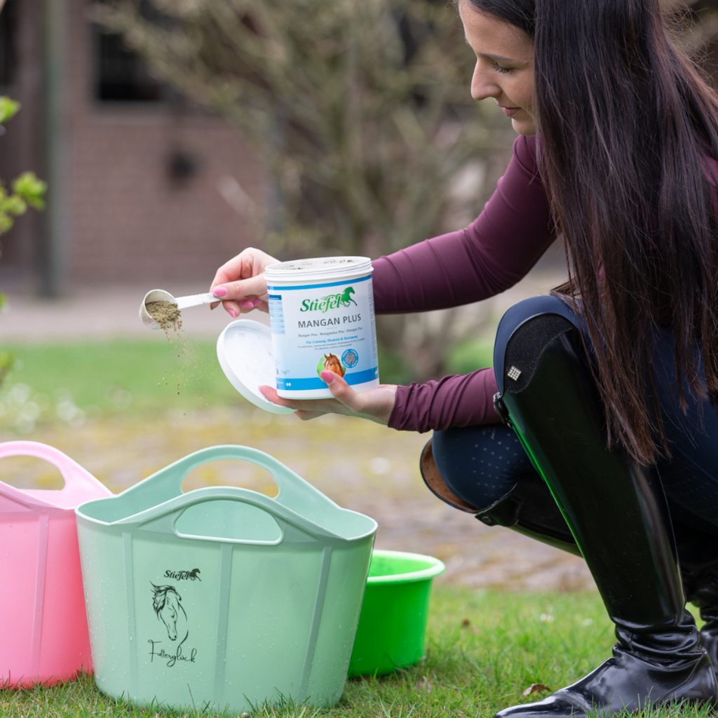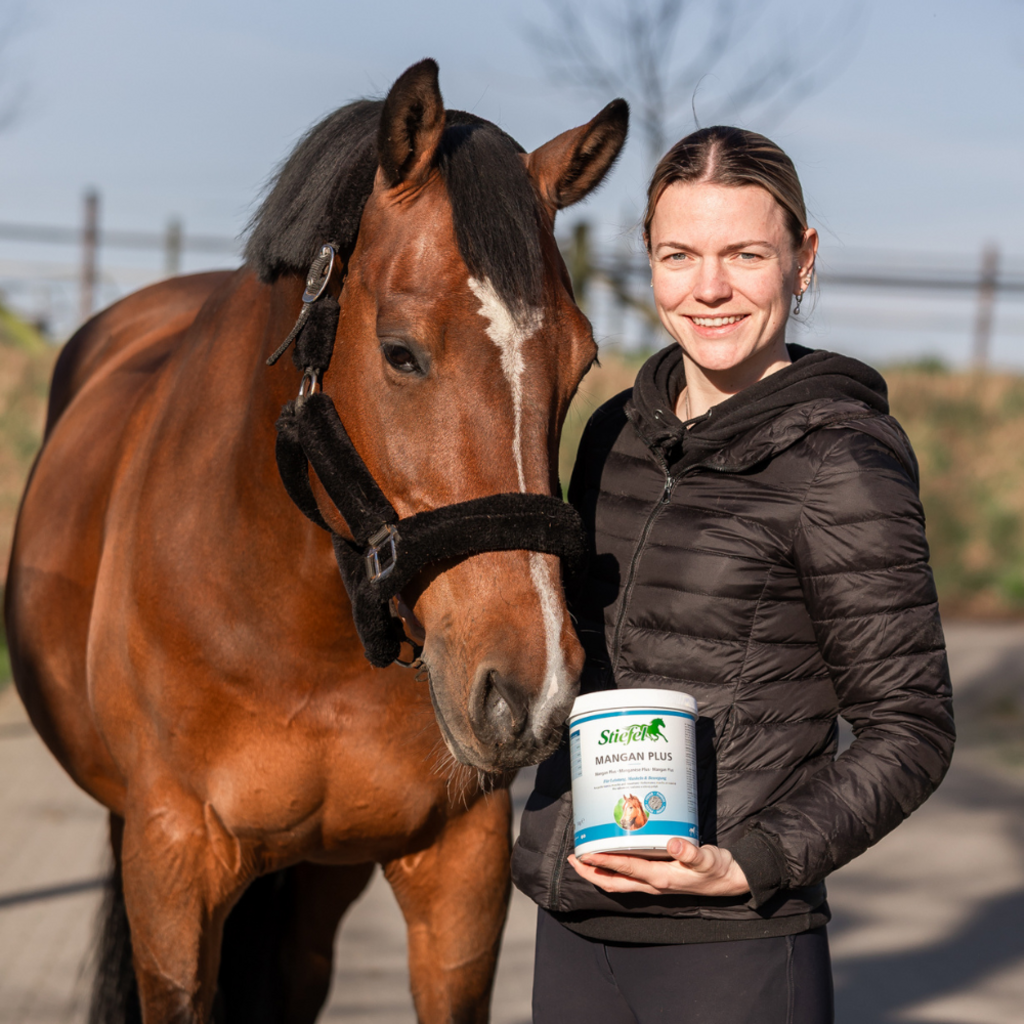 El manganeso plus de Stiefel contiene oligoelementos esenciales que pueden compensar las deficiencias nutricionales y ayudar a respaldar el sistema musculoesquelético. El manganeso está involucrado en muchos procesos musculares y articulares en el cuerpo y también es responsable de la formación de sulfato de condroitina. Los ingredientes ligados orgánicamente pueden ser utilizados de manera óptima por el cuerpo y tienen un efecto positivo en los tendones, huesos y articulaciones del caballo. Esto significa que este producto puede ayudar a mantener saludable el sistema musculoesquelético y mejorar la conducción. También puede contribuir a una regeneración más rápida de músculos, tendones y ligamentos estresados.