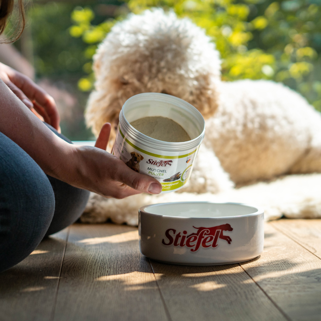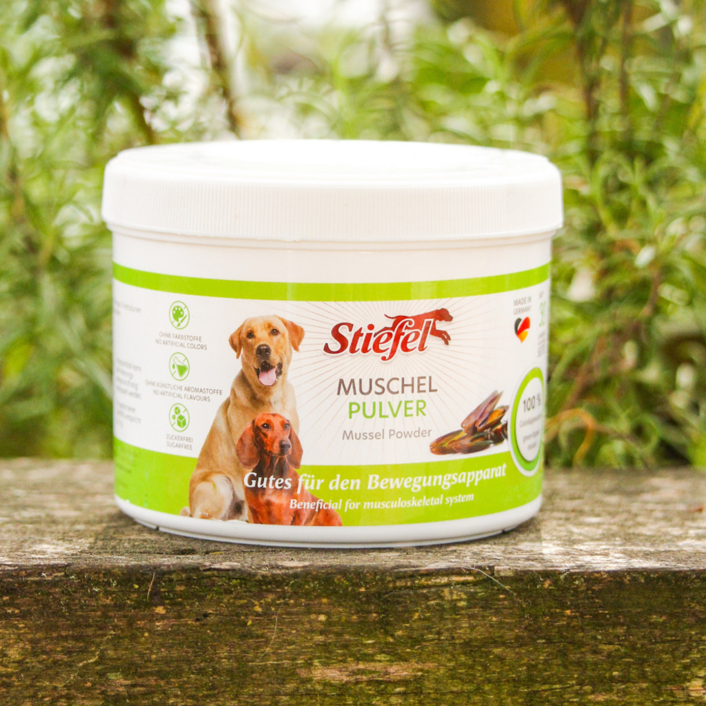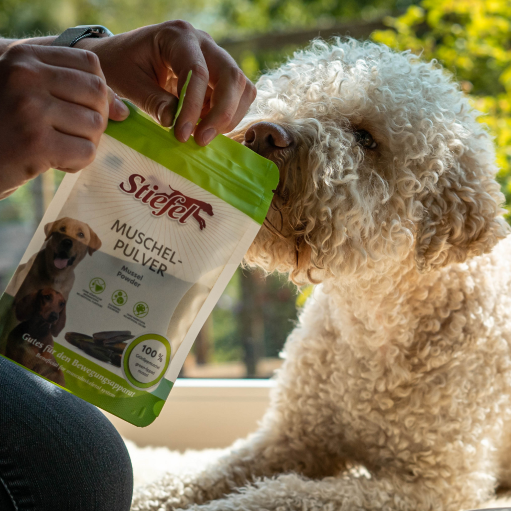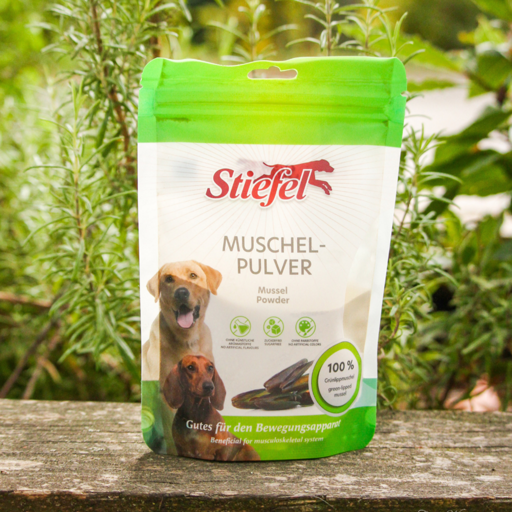 El polvo de mejillones de Stiefel está compuesto al 100 % por polvo de mejillones verdes. Este producto puede tener un efecto positivo en el sistema musculoesquelético, ya que contiene glicosaminoglicanos, importantes para el tejido conectivo. De hecho, el producto puede favorecer el sistema musculoesquelético y los movimientos de tu perro.