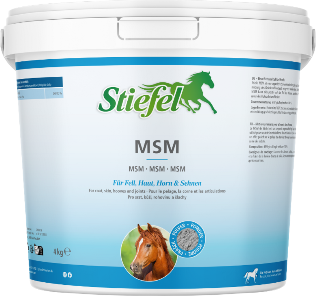 Stiefel MSM es un compuesto orgánico de azufre (metilsulfonilmetano) que puede tener un efecto positivo en la función saludable de las articulaciones. También puede favorecer un pelaje y un crecimiento del casco sanos y contribuir al desarrollo natural del tejido conjuntivo.