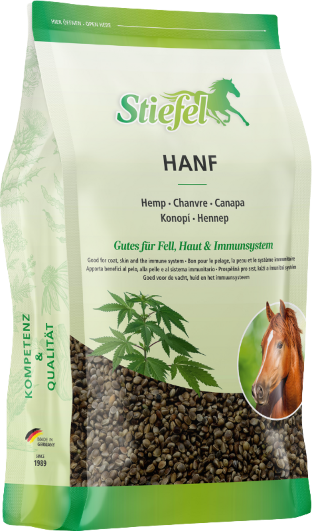 Las semillas de cáñamo son ricas en aminoácidos de alta calidad, proteínas de fácil digestión, oligoelementos esenciales y minerales. Los ácidos grasos omega-3 que contiene están en una proporción óptima de ácidos grasos omega-3 y omega-6 para el caballo. Además, las semillas de cáñamo contienen una gran cantidad de sustancias vegetales secundarias y vitaminas, pero sobre todo vitamina E. Gracias a los ingredientes de alta calidad, las semillas de cáñamo de Stiefel pueden fortalecer el sistema inmunitario y tener un efecto regulador del apetito. El cáñamo tiene grandes propiedades antioxidantes y, por lo tanto, puede contrarrestar la inflamación. La construcción muscular y los problemas cardiovasculares, la irritación de los nervios o la tensión muscular pueden verse influenciados positivamente por la alimentación con semillas de cáñamo. La bota de semillas de cáñamo también se usa con éxito para problemas de la piel como picor, reacciones alérgicas y caspa y tiene un efecto generalmente positivo en el pelaje y el crecimiento de los cascos. Los caballos con trastornos metabólicos también se benefician del bajísimo contenido de azúcar del cáñamo y de su efecto positivo sobre el metabolismo de las grasas y los azúcares.