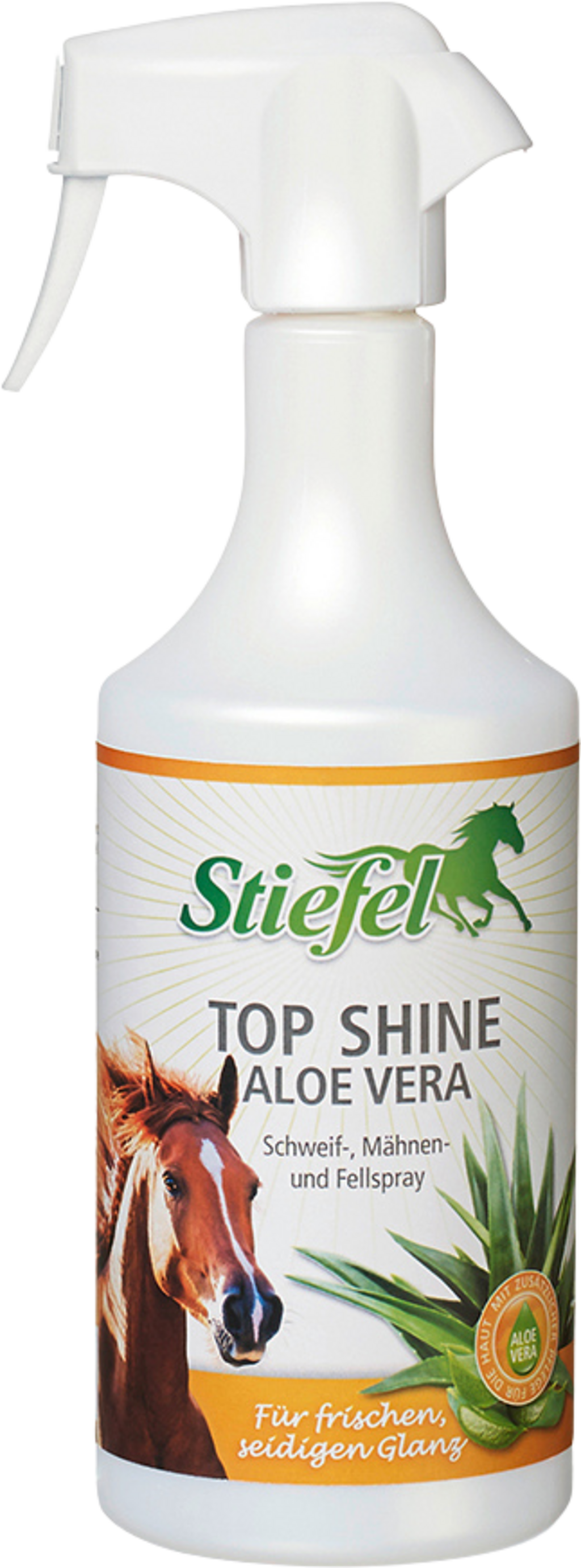 Top Shine Aloe Vera de Stiefel es un producto de cuidado de alta calidad para el pelaje, la crin y la cola del caballo. El aloe vera que contiene puede conseguir un efecto de cuidado adicional para la piel irritada. La crin y la cola son más fáciles de cepillar y desenredar. El pelaje se cuida con delicadeza y se le da un brillo sedoso. La película protectora invisible que rodea el cabello y el pelaje puede repeler el polvo y evitar que se vuelvan a formar enredos.