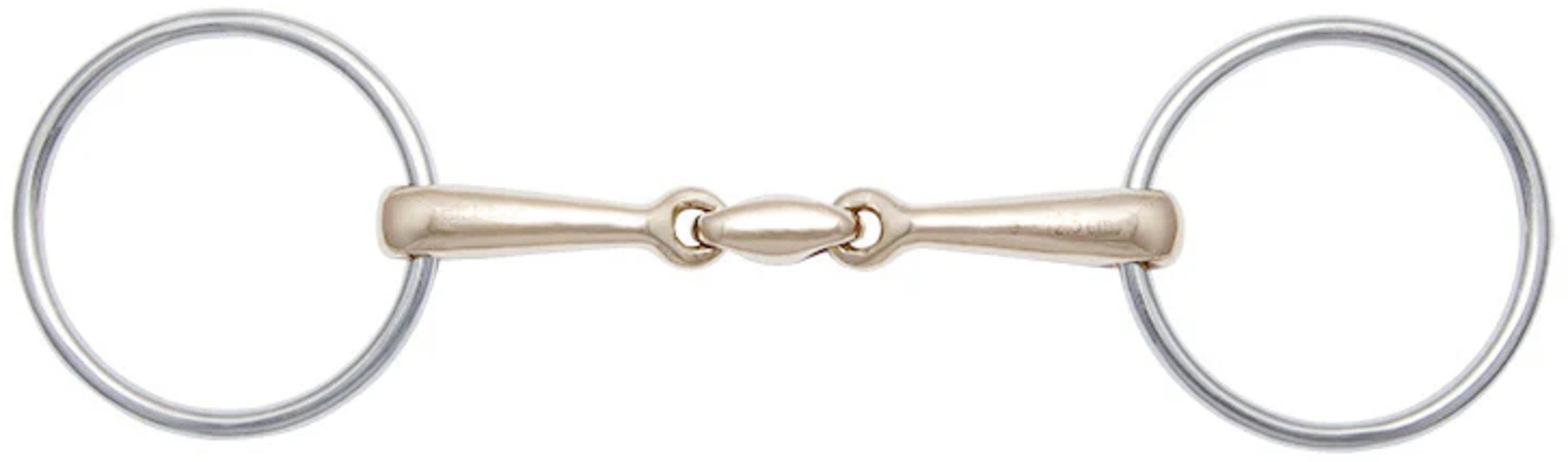 Este filete de tres piezas distribuye la presión de las riendas suave y uniformemente sobre la lengua y las piezas del filete. No provoca una presión desagradable en el paladar y el caballo acepta mejor el hierro. La pieza central de cobre dulce tiene un sabor agradable para el caballo y estimula la salivación.
