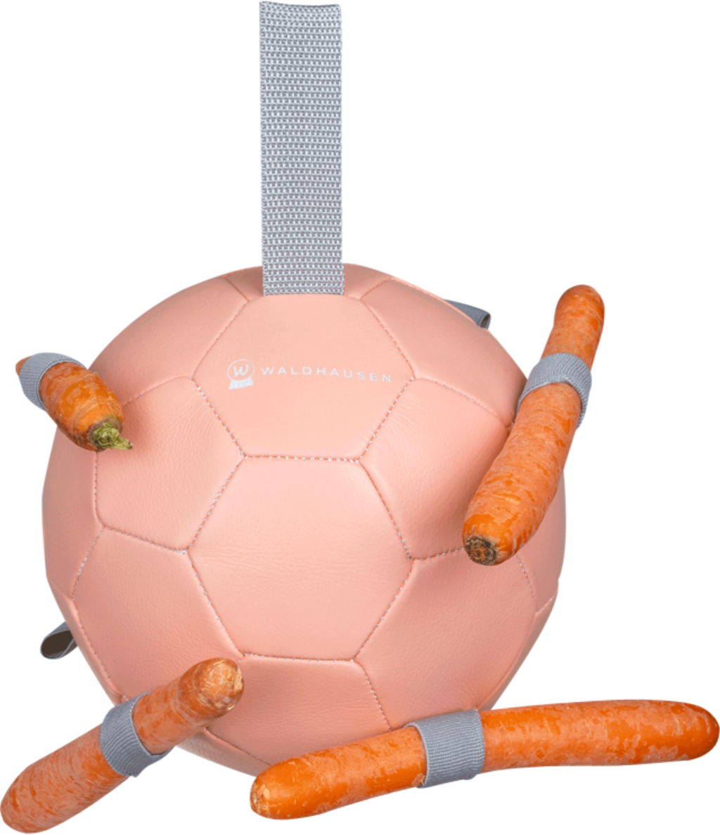 Los anillos de goma, estratégicamente colocados, son ideales para fijar zanahorias, manzanas, golosinas o incluso heno. Gracias al resistente anillo de nailon, puedes colgar fácilmente la pelota en el establo o en el exterior. Y para que la diversión pueda comenzar de inmediato, recibirás una bomba a juego incluida.