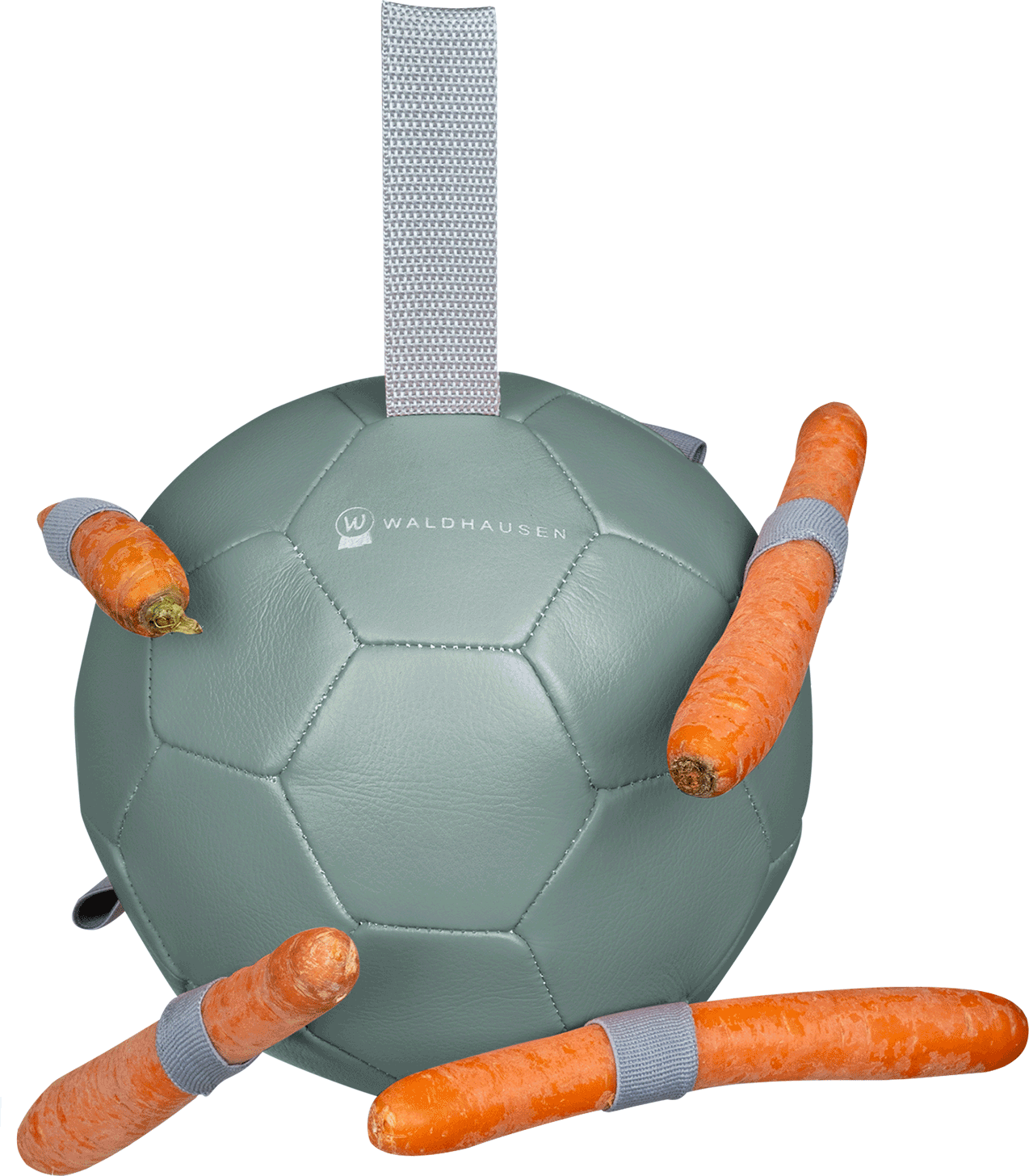 Los anillos de goma, estratégicamente colocados, son ideales para fijar zanahorias, manzanas, golosinas o incluso heno. Gracias al resistente anillo de nailon, puedes colgar fácilmente la pelota en el establo o en el exterior. Y para que la diversión pueda comenzar de inmediato, recibirás una bomba a juego incluida.