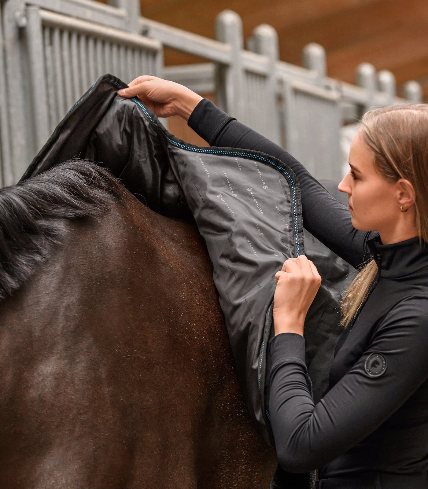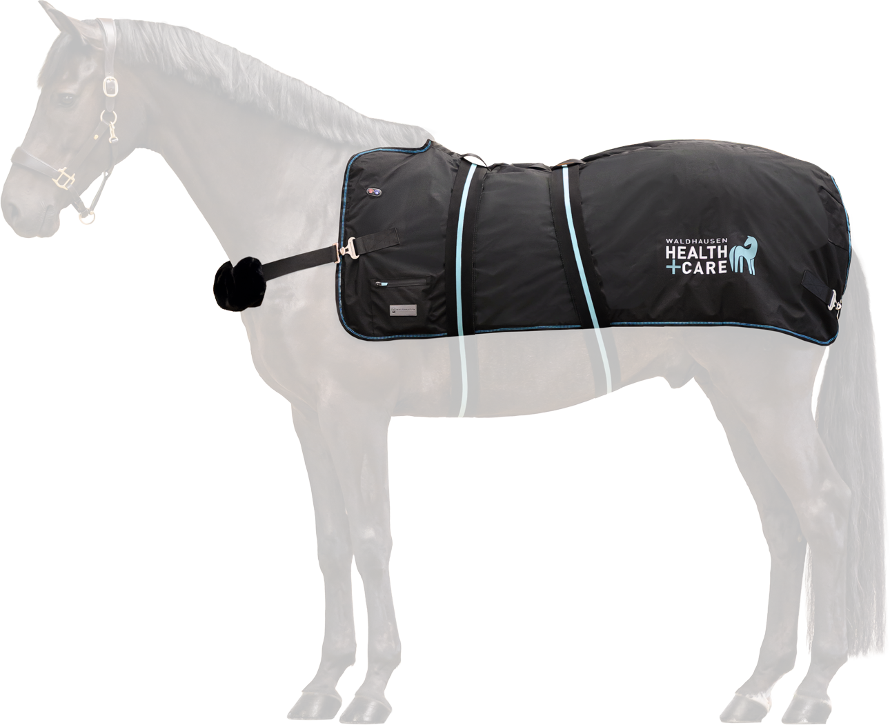 La manta puede utilizarse de forma flexible antes del entrenamiento para el calentamiento, después del trabajo para la regeneración o como apoyo durante la rehabilitación. Gracias a las correas elásticas incluidas, así como a las correas pectorales y posteriores extraíbles, la manta puede fijarse de forma segura. El revestimiento de pelo sintético extraíble en la correa pectoral garantiza un confort adicional y ayuda a prevenir rozaduras.