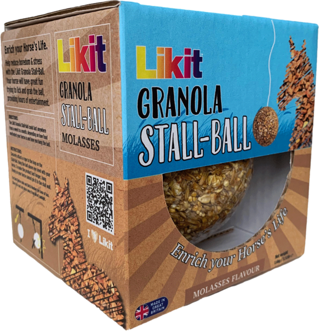 El Likit Granola Stall-Ball se cuelga rápidamente y proporciona al caballo diversión duradera mientras mastica. Ideal para animales propensos al estrés o al aburrimiento.