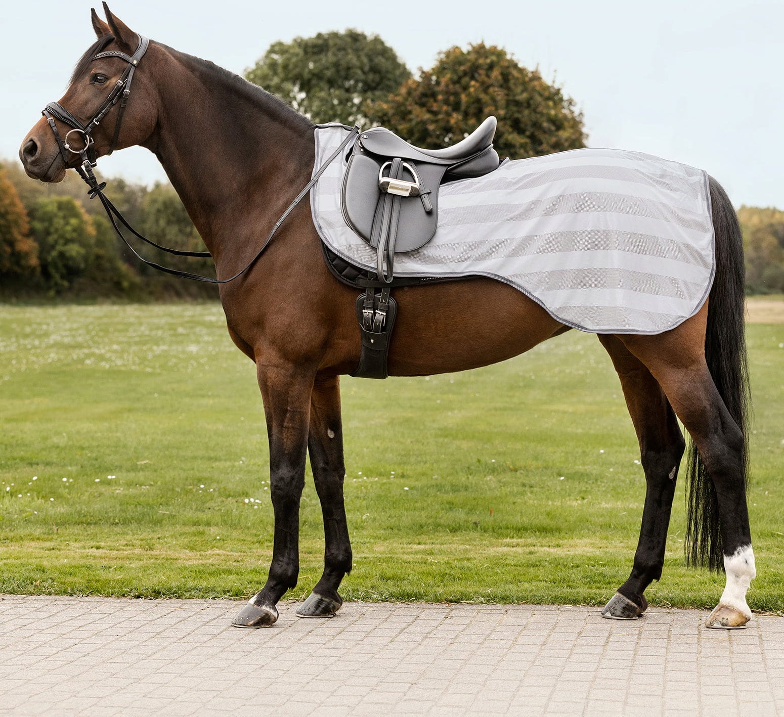 Gracias al corte lateral, la pierna permanece en estrecho contacto con el caballo, mientras que el tejido ligero garantiza una excelente circulación del aire. El cuello integrado puede fijarse fácilmente si es necesario, protegiendo así también la zona sensible del cuello frente a picaduras e irritaciones. Con el práctico cierre de velcro en la zona del pecho y el robusto cordón de cola, todo permanece firmemente en su sitio incluso en los aires más rápidos. La elección ideal para los jinetes que valoran la funcionalidad y una imbatible relación calidad-precio.