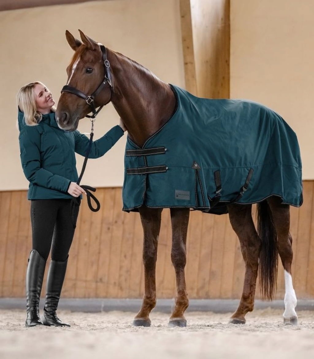 El ligero relleno de 50 g protege del frío sin sobrecalentar al caballo. En el interior, el forro antibacteriano garantiza la higiene y el máximo confort y, si hace aún más frío, se puede añadir fácilmente una manta interior adecuada gracias al sistema Clip-In. Para una mayor protección del cuello, la manta ya está equipada con cómodas presillas para una cubierta de cuello disponible por separado.