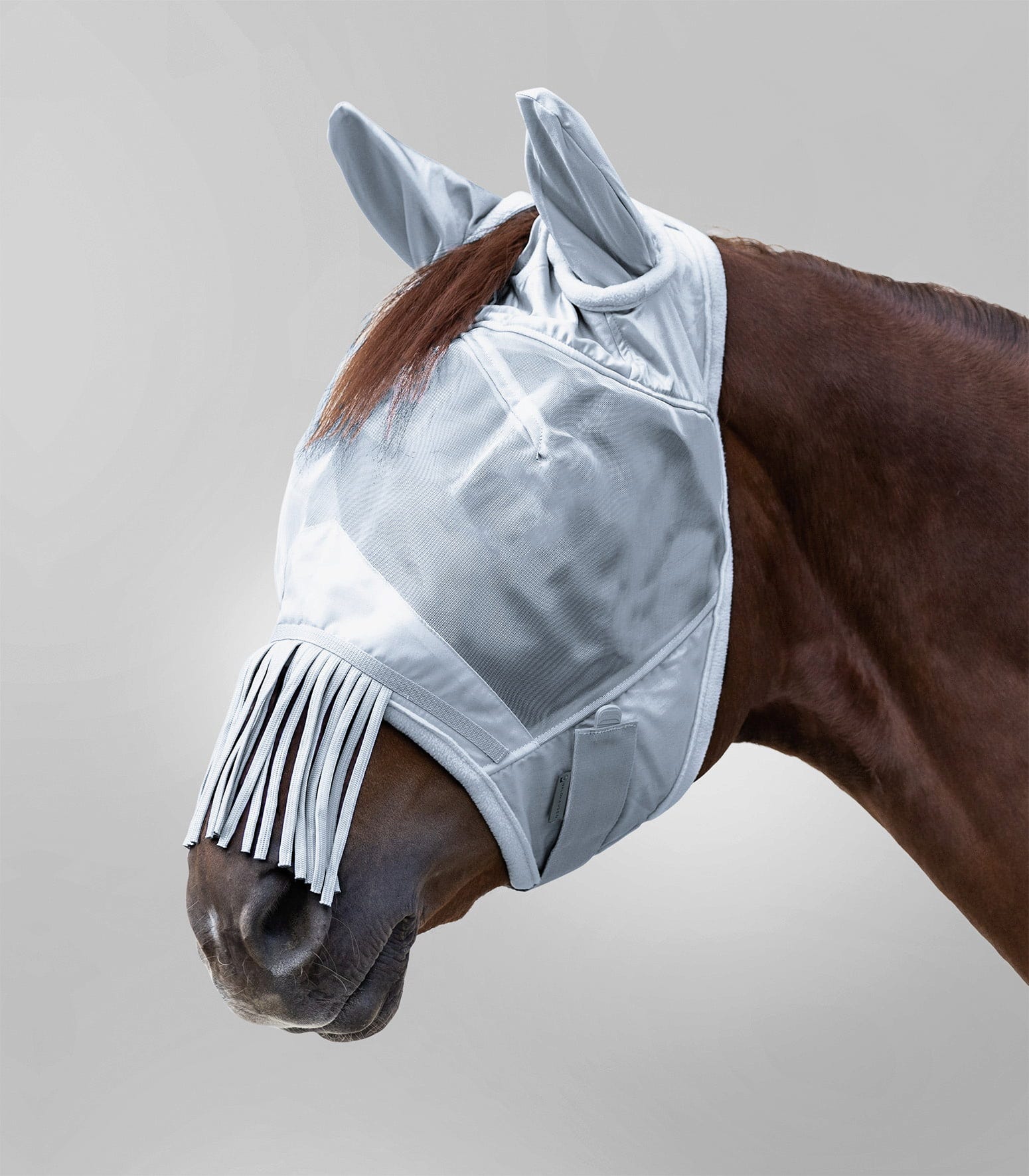 Máscara Antimoscas Premium con orejas y flecos para la nariz, gris plateado