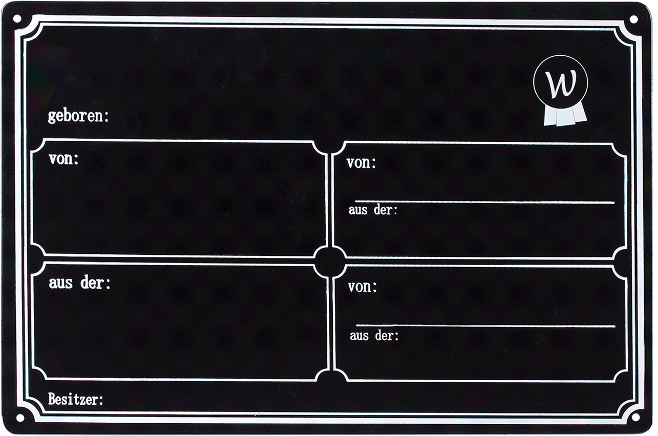La placa presenta un diseño clásico en blanco y negro y ofrece un amplio espacio para toda la información importante sobre tu caballo. Puedes utilizar tiza o un bolígrafo adecuado para escribir el pedigrí del caballo, la fecha de nacimiento y el nombre del propietario en los espacios cuidadosamente enmarcados. De esta manera, todo el mundo podrá ver toda la información necesaria de un solo vistazo.