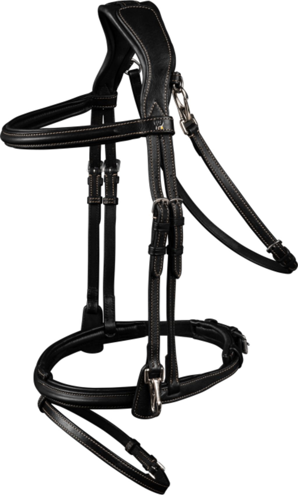 Para el bienestar de tu caballo, la testera está moldeada anatómicamente para distribuir de forma óptima la presión detrás de las orejas. La muserola combinada inglesa, la frontalera recta y la testera están suavemente acolchadas para ayudar a prevenir rozaduras. Fabricada en cuero de alta calidad de la línea X-Line y equipada con herrajes de acero inoxidable, esta cabezada ofrece durabilidad y funcionalidad para el uso diario.